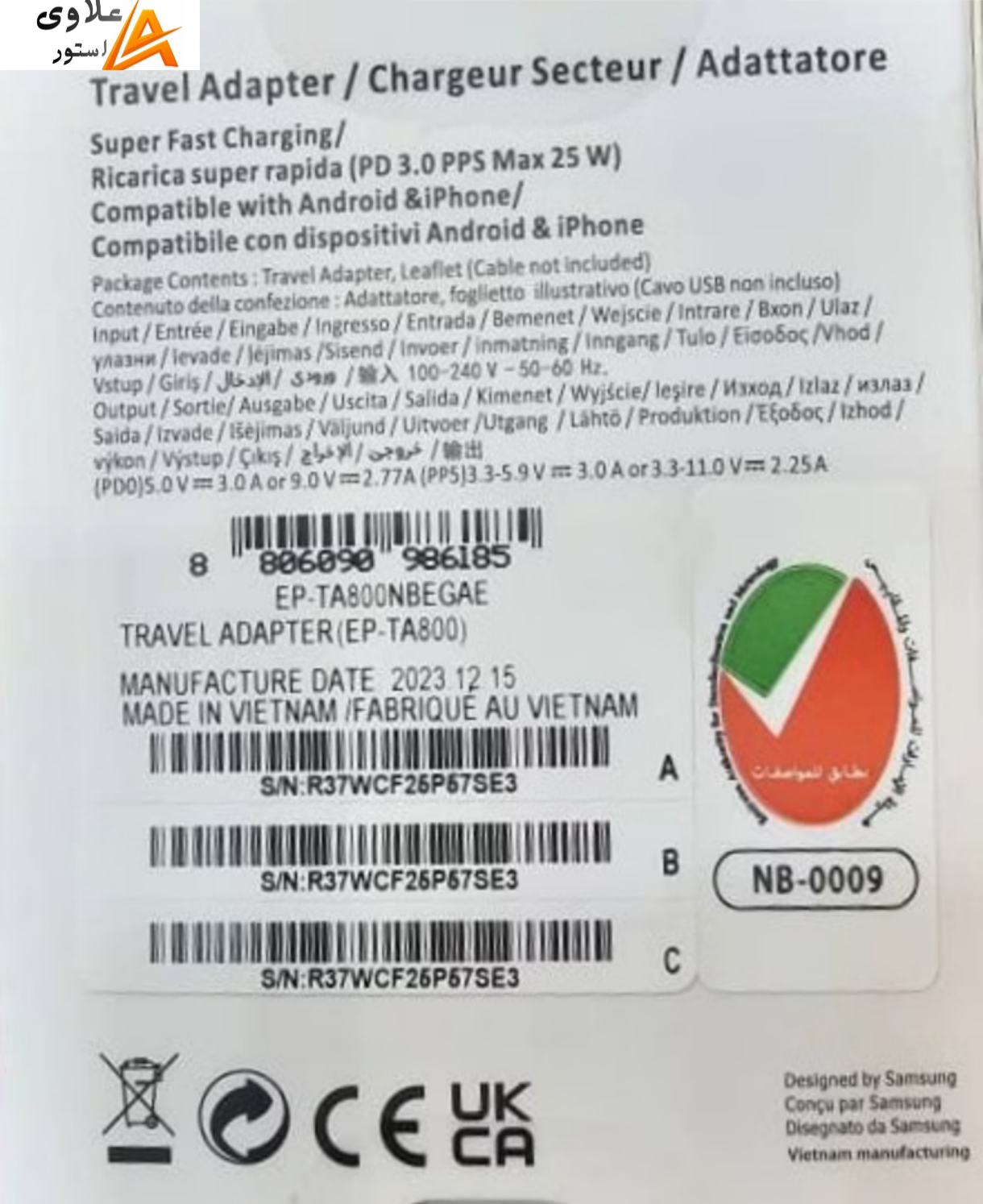 اما شارژر اصلی سامسونگ 25 وات تایپ C مطابق استانداردهای جهانی تولید شده و شارژی کاملاً امن و مطمئن ارائه میدهد.