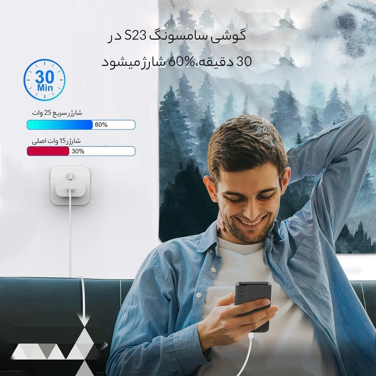 شارژر سامسونگ 25W Super Fast Charging با توان خروجی واقعی ۲۵ وات، گوشی شما را در مدتزمان کوتاه، ایمن و بدون آسیب به باتری شارژ میکند.